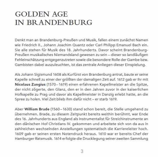 Nicolaus Zangius und William Brade wirkten als brandenburgische Hofkapellmeister unter Kurfürst Johann Sigismund (reg. 1608–1619); in dieser Zeit agierten Walter Rowe, Ambrosius Scherle, Bartholomäus Praetorius und Adam Jarzebsky als Hofmusiker. Unter Kurfürst Georg Wilhelm (reg. 1619–1640) sank die Kapelle während des Dreißigjährigen Krieges zur Bedeutungslosigkeit herab, bis Friedrich Wilhelm, später „der Große Kurfürst“ genannt, sie reorganisierte und zu neuer Blüte führte. Im 17. Jahrhundert galt die Gambe in den Niederlanden als englisches Instrument (genau wie die Laute als französisches) – da Friedrich Wilhelm in den Niederlanden aufwuchs und durch deren Vorbild geprägt wurde, ist es nicht verwunderlich, dass der Berliner Hof zu einem Zentrum der besten (englisch geprägten) Gambisten der damaligen Zeit wurde, etwa für Dietrich Stoeffken oder nach wie vor Walter Rowe. Friedrich Wilhelm spielte selbst Gambe und kannte das gängige Repertoire für dieses Instrument bestens, so sicherlich auch die hier eingespielten, teils in der Königlichen Bibliothek verwahrten Werke von Thomas Lupo, Matthew Locke, Georg Wolfgang Druckenmüller und Hieronymus Kradenthaller. Fünf der auf dieser CD enthaltenen Werke erfahren hier ihre Ersteinspielung.