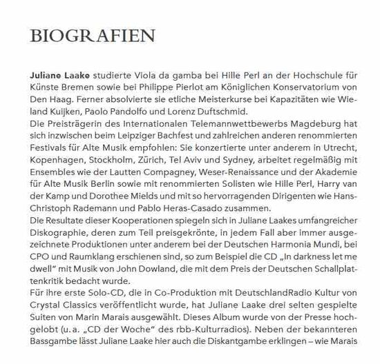 Denkt man an Brandenburg-Preußen und Musik, fallen einem zunächst Namen wie Friedrich II., Johann Joachim Quantz oder Carl Philipp Emanuel Bach ein. Sie alle stehen für Musik des 18. Jahrhunderts. Davor scheint Brandenburg-Preußen musikalisches Niemandsland gewesen zu sein – dieser so landläufigen Fehleinschätzung entgegenzutreten sowie die besondere Rolle der Gambe bzw. Gambisten dabei auszuleuchten, ist das zentrale Anliegen der vorliegenden Einspielung von Juliane Laake und ihrem Ensemble Art d’Echo.