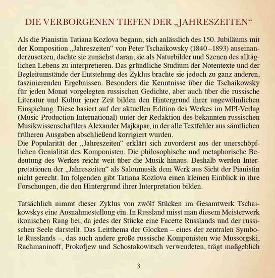 Als die Pianistin Tatiana Kozlova begann, sich anlässlich des 150. Jubiläums mit der Komposition „Jahreszeiten“ von Peter Tschaikowsky auseinanderzusetzen, dachte sie zunächst daran, sie als Naturbilder und Szenen des alltäglichen Lebens zu interpretieren. Das gründliche Studium der Notentexte und der Begleitumstände der Entstehung des Zyklus brachte sie jedoch zu ganz anderen, faszinierenden Ergebnissen. Besonders die Kenntnisse über die Tschaikowsky für jeden Monat vorgelegten russischen Gedichte, aber auch über die russische Literatur und Kultur jener Zeit bilden den Hintergrund ihrer ungewöhnlichen Einspielung.