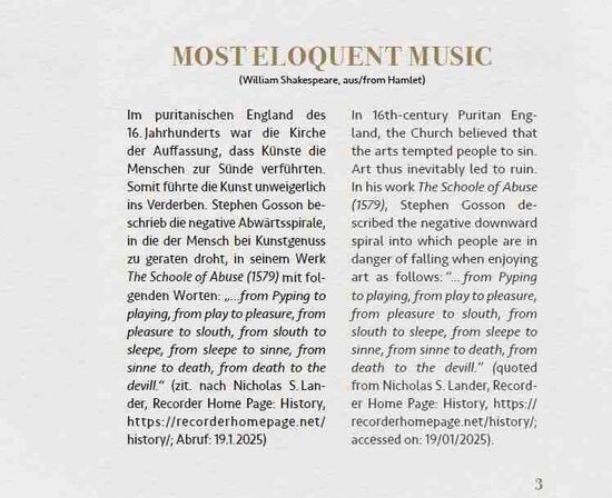 Sprach- und Wortgewandtheit, Zungenfertigkeit, Mitteilsamkeit begegnen dem Hörer auf der CD in allen Kompositionen, seien es original Trauerlieder, Tanzsätze oder Vokalmusik, auf unterschiedliche Weise. Alle Bemühungen in Komposition und Interpretation streben das höchste Ziel der Musik an, nämlich die Leidenschaften zu wecken. Laut den Puritanern führt dies ins Verderben, doch für die Musikerinnen wie den Hörer der CD beginnt hier das Wachsen und Erblühen.
