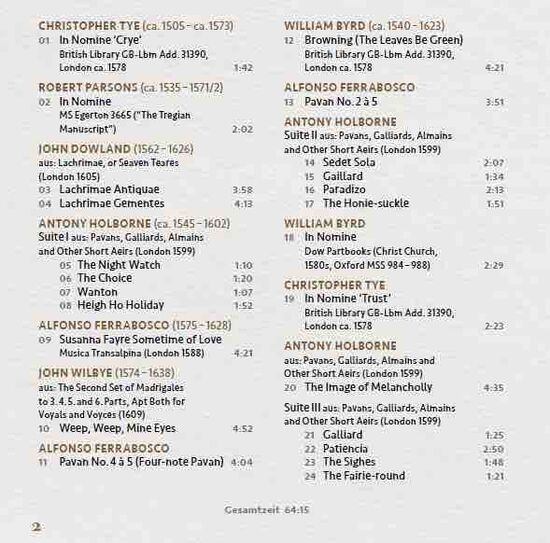 Im puritanischen England des 16. Jahrhunderts war die Kirche der Auffassung, dass Künste die Menschen zur Sünde verführten. Somit führte die Kunst unweigerlich ins Verderben. Dennoch, oder gerade deshalb, entlud sich in dieser restriktiven Zeit eine künstlerische Kraft, aus der meisterhafte Kunstwerke der Vokal- und der Instrumentalpolyphonie hervorgingen. Die Komponisten dieser Zeit verbinden eindrucksvoll kompositorisches Handwerk mit der melancholischen Grundhaltung der Zeit.