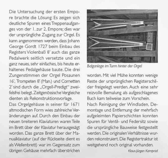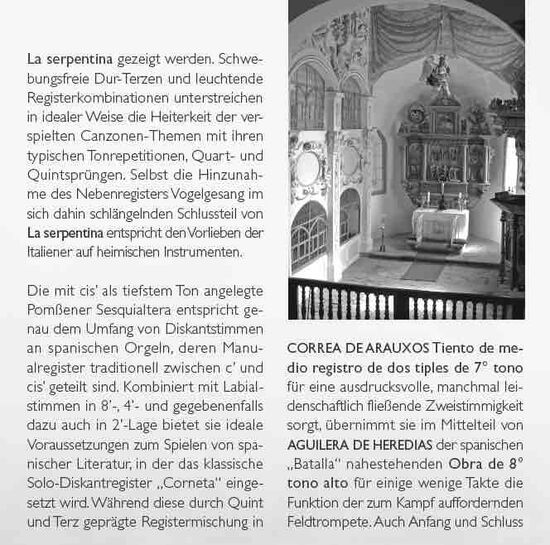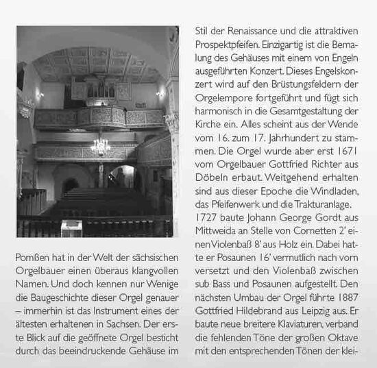 Die CD-Serie „Orgeln in Sachsen“ stellt in loser Folge interessante Orgeln aus den verschiedensten Regionen des heutigen Freistaates vor. Vol. 4 rückt dabei eines der ältesten heute noch existierenden Instrumente Sachsens ins gebührende Licht, nämlich die Richter-Orgel von 1671 in der Wehrkirche zu Pomßen südöstlich von Leipzig. Geht man allein vom optischen Erscheinungsbild aus, würde man sogar ein noch früheres Baujahr vermuten, denn der Prospekt erweckt eher den Eindruck einer Orgel aus der Zeit der Renaissance. Tatsächlich wurde das komplette Instrument aber erst 1671 von Gottfried Richter aus Döbeln erbaut, eindeutige Beweise für ein Vorgängerinstrument konnten bei der 2000 begonnenen und 2007 erfolgreich abgeschlossenen Restaurierung nicht gefunden werden. Auch die erhaltene Predigt des Gottesdienstes zur Orgelweihe am Palmsonntag, 22. März 1671, liefert hierfür keine Anhaltspunkte. Dafür konnten ihr viele andere wichtige Informationen entnommen werden, die für die Restaurierung und Rückführung auf einen möglichst originalgetreuen Zustand hilfreich waren. Ein großer Teil der Pfeifen stammt noch original aus dem Bestand von 1671. Aber nicht nur der Orgelprospekt weist in eine frühere Zeit zurück, auch das klangliche Konzept der Orgel ist eher zwischen Spätrenaissance und Frühbarock anzusiedeln. Allerdings läßt sich damit nicht nur deutsche Musik aus den genannten Epochen gut darstellen, sondern ebenso italienische und spanische. Den Beweis dafür tritt Roland Börger mit der vorliegenden CD an, welche Werke aus den genannten Kulturkreisen koppelt.