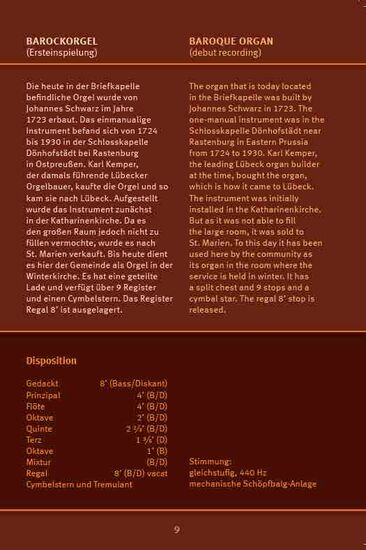 Die vorliegende Einspielung vereint erstmals alle drei Orgeln in der Lübecker Marienkirche auf einer CD. Neben der Großen Orgel und der Totentanz-Orgel wurde zum ersten Mal auch die kleine einmanualige Barockorgel in der sogenannten Briefkapelle aufgenommen, von Johannes Schwarz 1723 in Ostpreußen erbaut und seit 1930 in Lübeck befindlich. Zugleich handelt es sich um die erste Lübecker Einspielung mit dem neuen Marienorganisten Johannes Unger. Der Bachpreisträger des Jahres 2000 spannt auf der CD einen Bogen von den Lübecker Urvätern Tunder und Buxtehude (Totentanz-Orgel, Orgelbau Führer, 1986) über Buxtehudes Besucher Johann Sebastian Bach (Barockorgel) bis hin zu den romantischen Komponisten der jüngeren Jahrhunderte, deren Klangvorstellungen mit den technischen Möglichkeiten der 1968 von der Firma Kemper erbauten fünfmanualigen Großen Orgel umgesetzt werde