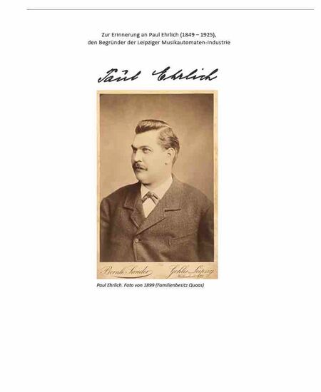 Am Beginn dieser bemerkenswerten Blütezeit stand die Erfindung eines hiesigen Klavierbauers: Paul Ehrlich erhielt 1882 das Patentrecht für sein Ariston, eine kleine Harmonika zum Kurbeln mit leicht auswechselbaren, billigen Lochplatten aus Pressspan. Ohne es zu ahnen, begründete er in Leipzig einen neuen Industriezweig: die massenhafte Musikautomaten-Produktion mit leicht auswechselbaren Lochplatten und Notenrollen.