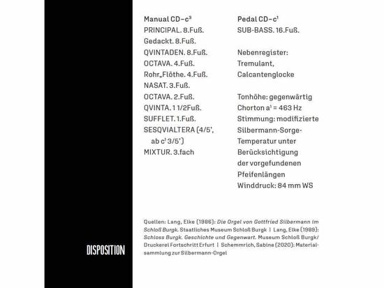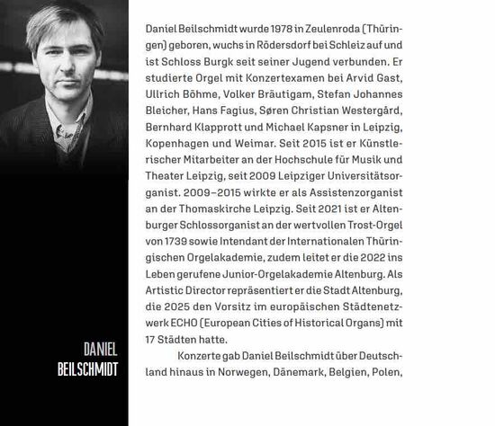 Das Programm stellt sowohl ganz wörtlich Variationswerke aus der Entstehungszeit der Burgker Silbermann-Orgel als auch die gesamte Palette barocker Struktur- und Klangkonstellationen auf einem einmanualigen Instrument vor. Dies geschieht mit einem vielfarbigen, virtuosen und emotional vielfältigen Zugriff. Daniel Beilschmidt, Universitätsorganist in Leipzig und Schlossorganist in Altenburg, ist nicht weit entfernt von Schloss Burgk aufgewachsen und kennt das Instrument und seine klanglichen Möglichkeiten sehr genau.