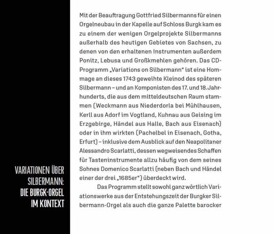 Mit der Beauftragung Gottfried Silbermanns für einen Orgelneubau in der Kapelle auf Schloss Burgk, einer wehrhaften mittelalterlichen Anlage im heutigen ostthüringischen Saale-Orla-Kreis, kam es zu einem der wenigen Orgelprojekte Silbermanns außerhalb des heutigen Gebietes von Sachsen. Das CD-Programm „Variations on Silbermann“ ist eine Hommage an dieses 1743 geweihte Kleinod des späteren Silbermann – und an Komponisten des 17. und 18. Jahrhunderts, die aus dem mitteldeutschen Raum stammen (Matthias Weckmann aus Niederdorla bei Mühlhausen, Johann Caspar Kerll aus Adorf im Vogtland, Johann Kuhnau aus Geising im Erzgebirge, Georg Friedrich Händel aus Halle, Johann Sebastian Bach aus Eisenach) oder in ihm wirkten (Johann Pachelbel in Eisenach, Gotha, Erfurt) – inklusive dem Ausblick auf den Neapolitaner Alessandro Scarlatti, dessen wegweisendes Schaffen für Tasteninstrumente allzu häufig von dem seines Sohnes Domenico Scarlatti überdeckt wird.