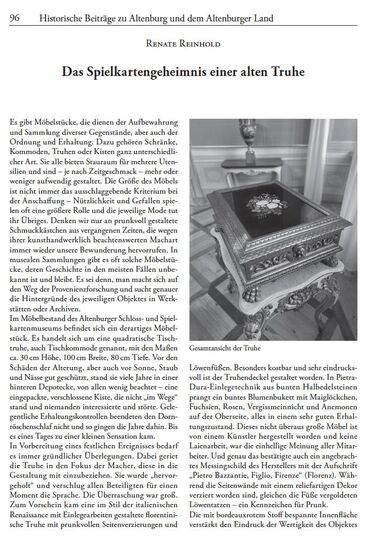 Ein Dokument ganz besonderer Art ziert seine Titelseite. 1967 wurden im Lindenau-Museum Altenburg fünf frühitalienische Tafelgemälde gestohlen. Über diesen bis heute nicht aufgeklärten Raub, der gerade in Zeiten der Diebstähle im Bode-Museum Berlin, im Grünen Gewölbe Dresden oder im Louvre in Paris besonderes Interesse hervorrufen könnte, bisher aber publizistisch völlig unbearbeitet war, berichtet Mirko Krüger in seinem Beitrag. Die Gemälde sind zumindest noch als Fotos überliefert, und eines davon, eine gegen Ende des 15. Jahrhunderts in Florenz entstandene Madonna, ist auf der aktuellen Titelseite zu sehen. Verschiedene Rückblicke auf das Geschehen der vergangenen 12 Monate und ein Statistikteil runden das Buch in gewohnter Weise ab.