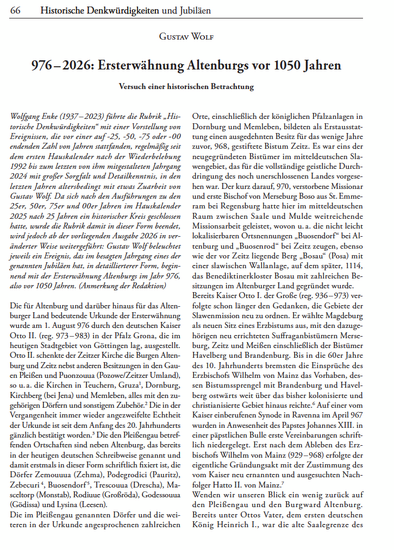 Historische Dokumente auszuwerten ist immer wieder spannend. Der Altenburger Geschichts- und Hauskalender für das Jahr 2026, der 35. Jahrgang der neuen Folge, bietet eine größere Zahl an Beispielen dafür. Schon die Fundumstände können ziemlich speziell sein, wenn etwa Grit Martinez über die beim Abriss einer Altenburger Gartenlaube entdeckten, seit 1933 dort eingemauert gewesenen SPD-Parteibücher berichtet. Auch archäologische Funde stellen in gewisser Weise Dokumente über das Leben unserer Altvorderen dar, etwa die Siedlungsspuren, die bei Grabungen an Maststandorten einer Stromleitung im südlichen Altenburger Land gewonnen werden konnten. Wenn die Dokumente das bisherige historische Bild bestätigen, ist das eine schöne Sache, aber wenn man welche entdeckt, die diesem Bild widersprechen, muss man genauer überlegen und kommt bisweilen auch Fälschungen auf die Spur. Karlheinz Hengst berichtet etwa aus der Frühgeschichte der Stadt Schmölln über den in einer Urkunde genannten Graf Bruno und den Umstand, dass es diesen Grafen zumindest in der bisher postulierten Form nie gegeben hat.