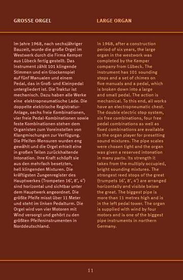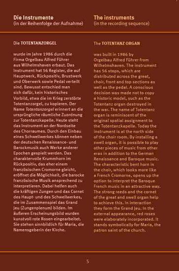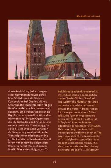 Die vorliegende Einspielung vereint erstmals alle drei Orgeln in der Lübecker Marienkirche auf einer CD. Neben der Großen Orgel und der Totentanz-Orgel wurde zum ersten Mal auch die kleine einmanualige Barockorgel in der sogenannten Briefkapelle aufgenommen, von Johannes Schwarz 1723 in Ostpreußen erbaut und seit 1930 in Lübeck befindlich. Zugleich handelt es sich um die erste Lübecker Einspielung mit dem neuen Marienorganisten Johannes Unger. Der Bachpreisträger des Jahres 2000 spannt auf der CD einen Bogen von den Lübecker Urvätern Tunder und Buxtehude (Totentanz-Orgel, Orgelbau Führer, 1986) über Buxtehudes Besucher Johann Sebastian Bach (Barockorgel) bis hin zu den romantischen Komponisten der jüngeren Jahrhunderte, deren Klangvorstellungen mit den technischen Möglichkeiten der 1968 von der Firma Kemper erbauten fünfmanualigen Großen Orgel umgesetzt werde