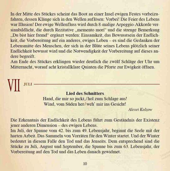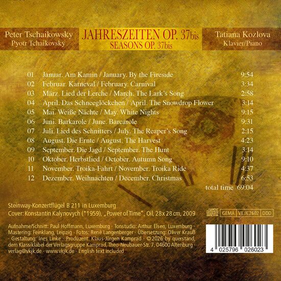 Als die Pianistin Tatiana Kozlova begann, sich anlässlich des 150. Jubiläums mit der Komposition „Jahreszeiten“ von Peter Tschaikowsky auseinanderzusetzen, dachte sie zunächst daran, sie als Naturbilder und Szenen des alltäglichen Lebens zu interpretieren. Das gründliche Studium der Notentexte und der Begleitumstände der Entstehung des Zyklus brachte sie jedoch zu ganz anderen, faszinierenden Ergebnissen. Besonders die Kenntnisse über die Tschaikowsky für jeden Monat vorgelegten russischen Gedichte, aber auch über die russische Literatur und Kultur jener Zeit bilden den Hintergrund ihrer ungewöhnlichen Einspielung.