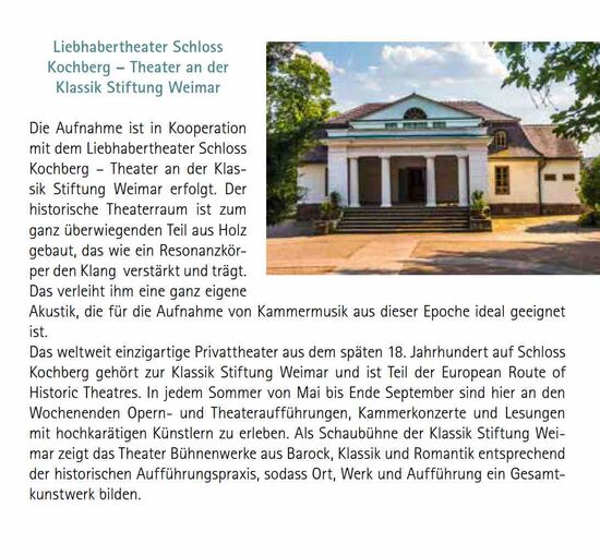 Schon bei der Videoaufnahme war der Silbermann-Hammerflügel von Kerstin Schwarz zum Einsatz gekommen, seine farbliche und dynamische Flexibilität passt ideal zu dieser Musik zwischen Empfindsamkeit, Sturm und Drang und Klassik. Seine Klangcharakteristik, die sich stark von der späterer Wiener Instrumente unterscheidet, hat die beiden Musiker zu einer klanglich-musikalischen Entdeckungsreise gebracht, deren Ergebnis auf der vorliegenden CD zu hören ist. In Räumen wie dem Liebhabertheater Schloss Kochberg ist dieses Repertoire zur Aufführung gekommen: Obwohl später entstanden als Johann Ernst Bachs Sonaten, gibt dieser historische Raum der Weimarer Klassik ihnen mit seiner klanglichen Intimität einen idealen Rahmen. Die Musiker und der Tonmeister Mathias Kiesling haben sich für eine sehr puristische Aufnahmetechnik entschieden: Lediglich besonders hochwertige Raummikrofone kamen zum Einsatz, die sehr sorgfältig im Theater positioniert wurden, um dessen intime Akustik voll zur Geltung zu bringen.