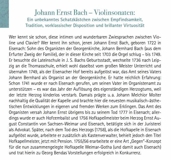 Claudia Mende und Gerd Amelung musizieren seit ihrer Studienzeit immer wieder miteinander, in Ensemble- und Orchesterkonzerten ebenso wie in kammermusikalischen Projekten. Im Rahmen der Reihe „Klingende Thüringer Residenzen“ hatten sie die g-Moll-Sonate von Johann Ernst Bach (1722–1777) auf Video aufgenommen – und das Stück hat sie derart überzeugt, dass die Idee der nun vorliegenden Gesamteinspielung von Bachs 1770 bzw. 1772 gedruckten sechs Sonaten für Clavier und Violine entstand. Johann Ernst Bach gehört zu den zahlreichen musikalischen Mitgliedern der Familie Bach, lernte als Thomasschüler unter seinem Patenonkel Johann Sebastian Bach und wirkte ab 1749 als Nachfolger seines Vaters Johann Bernhard Bach als Organist an der Georgenkirche in Eisenach; außerdem war er Cembalist an der Eisenacher bzw. Weimarer Hofkapelle.