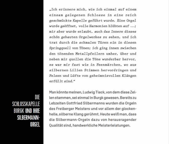 Mit der Beauftragung Gottfried Silbermanns für einen Orgelneubau in der Kapelle auf Schloss Burgk im Jahr 1743 kam es zu einem der wenigen Orgelprojekte Silbermanns außerhalb des heutigen Gebietes von Sachsen. Das CD-Programm „Variations on Silbermann“ ist eine Hommage an dieses Kleinod des späteren Silbermann – und an Komponisten des 17. und 18. Jahrhunderts, die aus dem mitteldeutschen Raum stammen. Das Programm stellt sowohl ganz wörtlich Variationswerke aus der Entstehungszeit der Burgker Silbermann-Orgel als auch die ganze Palette barocker Struktur- und Klangkonstellationen auf einem einmanualigen Instrument vor.